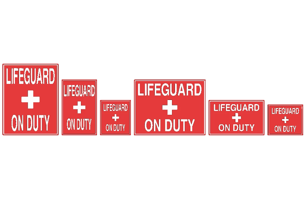 - This sign is offered as a red sign with white “LIFEGUARD + ON DUTY” lettering.