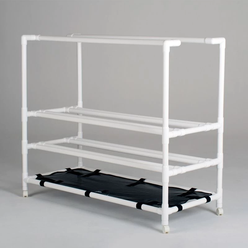 Hydro fit’s sturdy and lightweight Multi-Purpose Storage Rack 18 provides efficient storage for up to 18 pairs of HYDRO-FIT Cuffs or Mini Cuffs, or 18 WAVE Belts® or WAVE Belt PROs, and 18 pairs of Hand Buoys. Durable and portable, our Storage Rack rolls easily on the surface of your pool deck and is designed to fit through a standard 36″ doorway for convenient and secure off-deck storage. Includes our Rack 18 Hammock (Item #270) for additional storage at the base. Manufactured from commercial grade PVC pipe. 58″ high x 27″ deep x 65″ wide. Ships partially assembled. Proudly Made In the USA.
