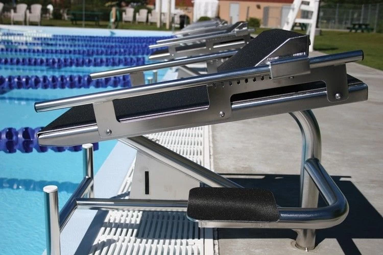 Applying the latest in approved technology, the Xcellerator Starting Platform contains an adjustable track start wedge and hand grips to give swimmers an extra boost on starts by allowing the knee to start at a 90 degree angle. The superior grit finish on the platform top reduces slipping while the H-style backstroke bar give backstroke swimmers numerous gripping options. Show your team spirit with the addition of a custom logo or powder coating the block to match your team’s colors.