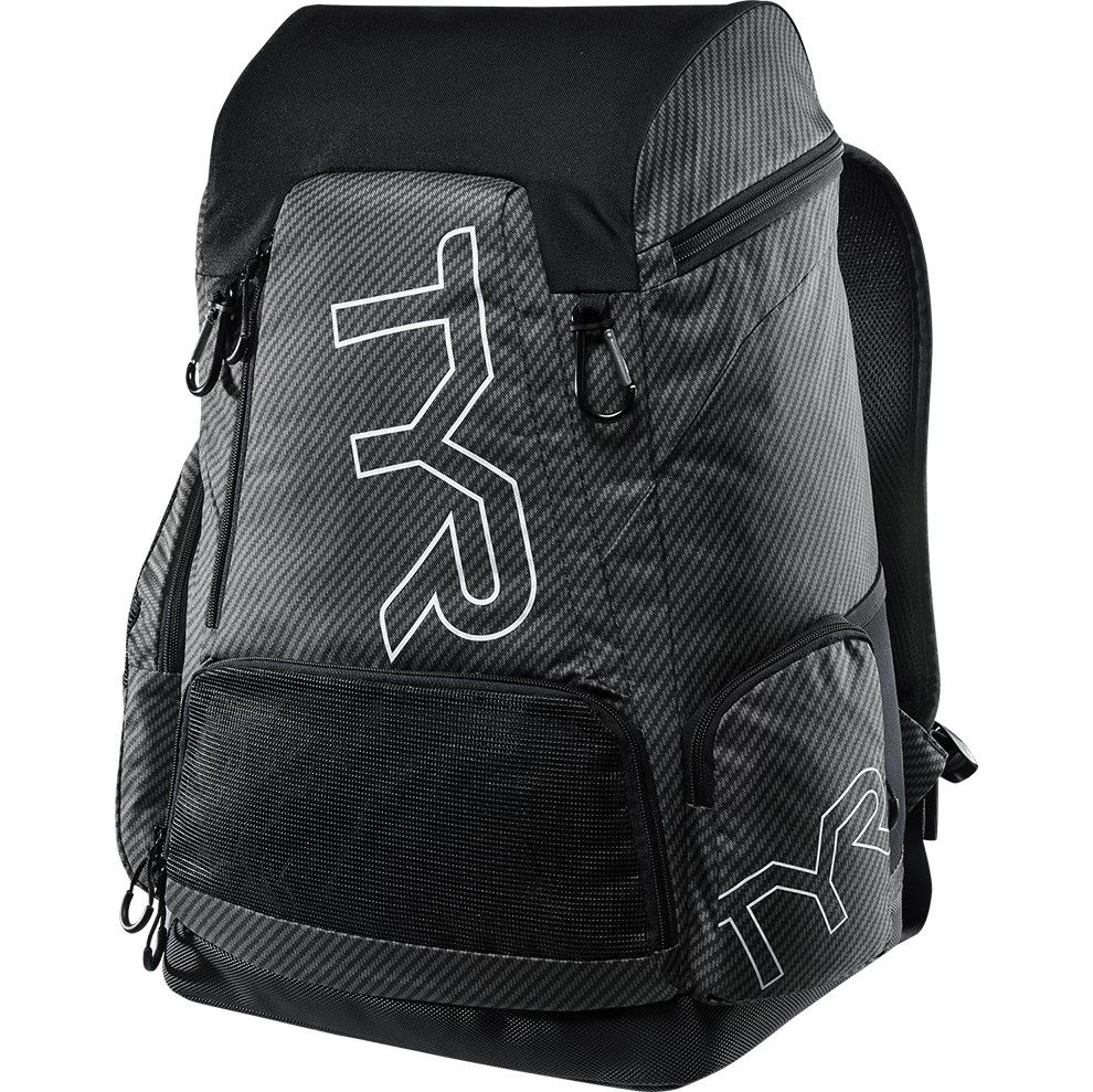 The TYR Alliance 45L Backpack-Team Carbon is designed with fabric technology to ensure a lightweight feel and durable, water resistant construction.